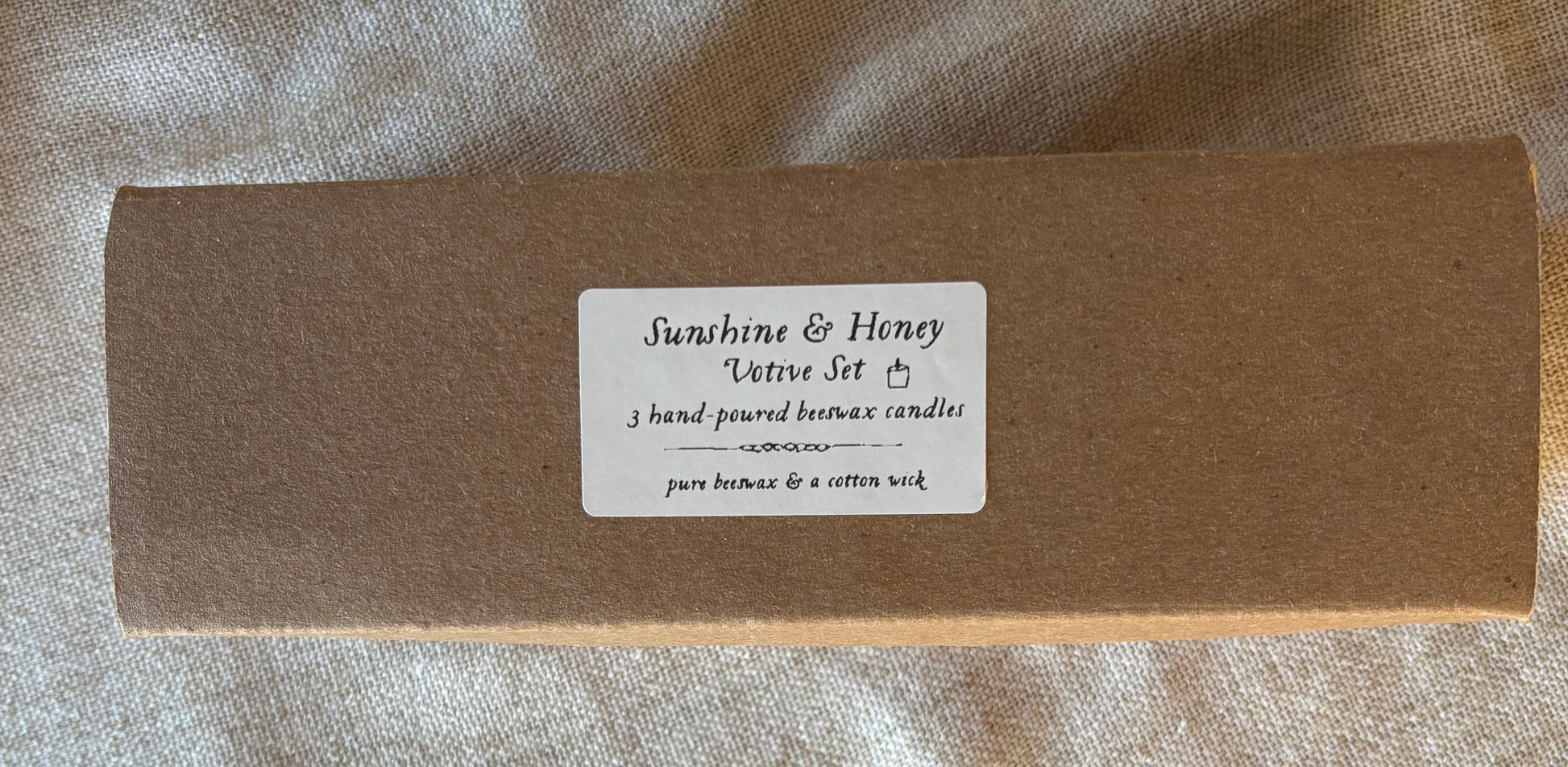 A warm, bright glow in three large beeswax votives. Enjoy long burn time, a steady flame, and simple styling—perfect atop a cute plate or tray for an effortless touch of sunshine.
