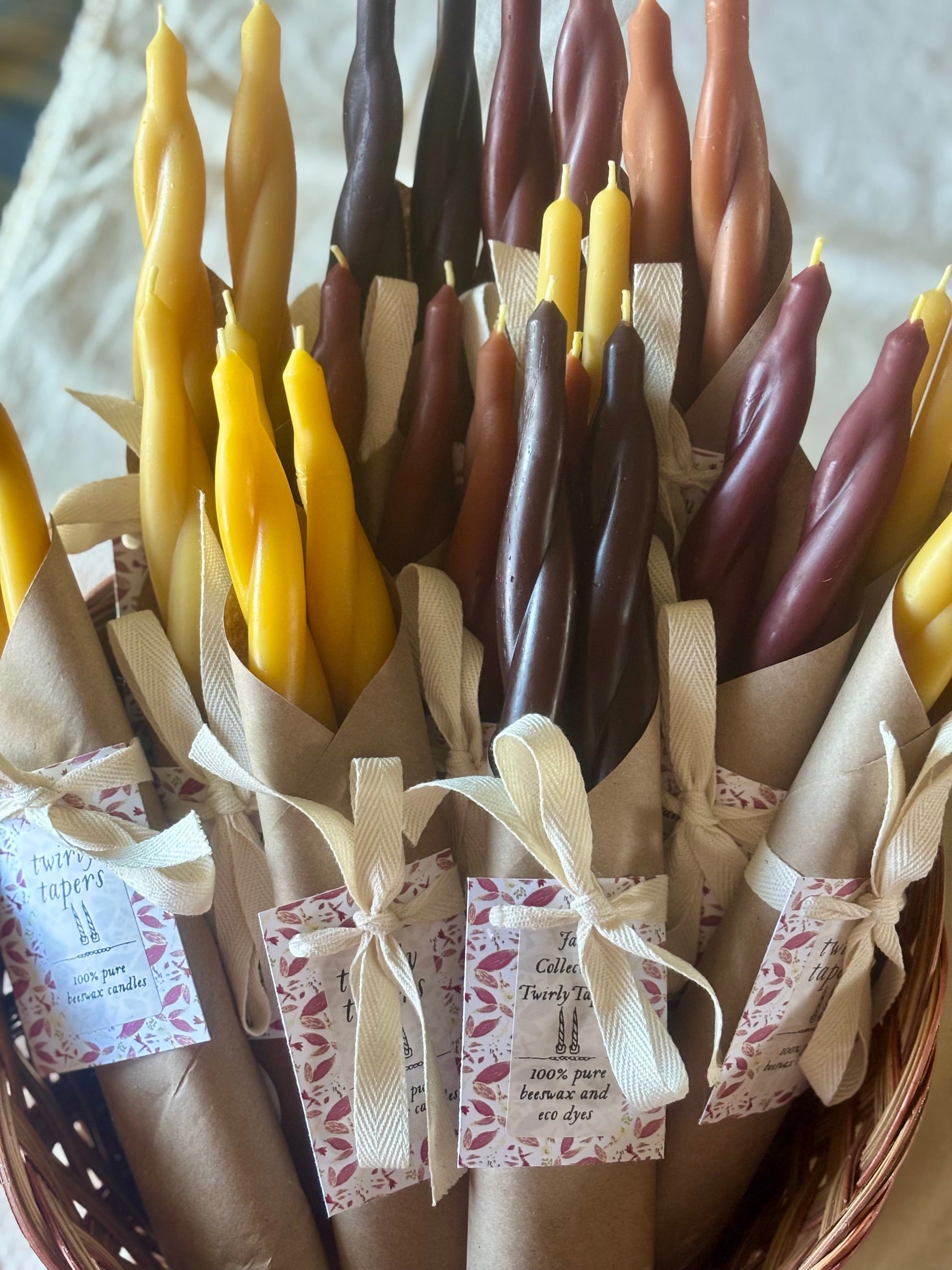 Bring a unique candle pair to your table with our Twirly Taper candles, hand-filtered and poured from 100% pure beeswax sourced from a local Pennsylvania bee farm. Each 11-inch candle is poured by hand, and offers up to 11 hours of clean, natural burn time. The experience of these candles is like sunshine & honey- the scent of honey and the golden glow of the sun.